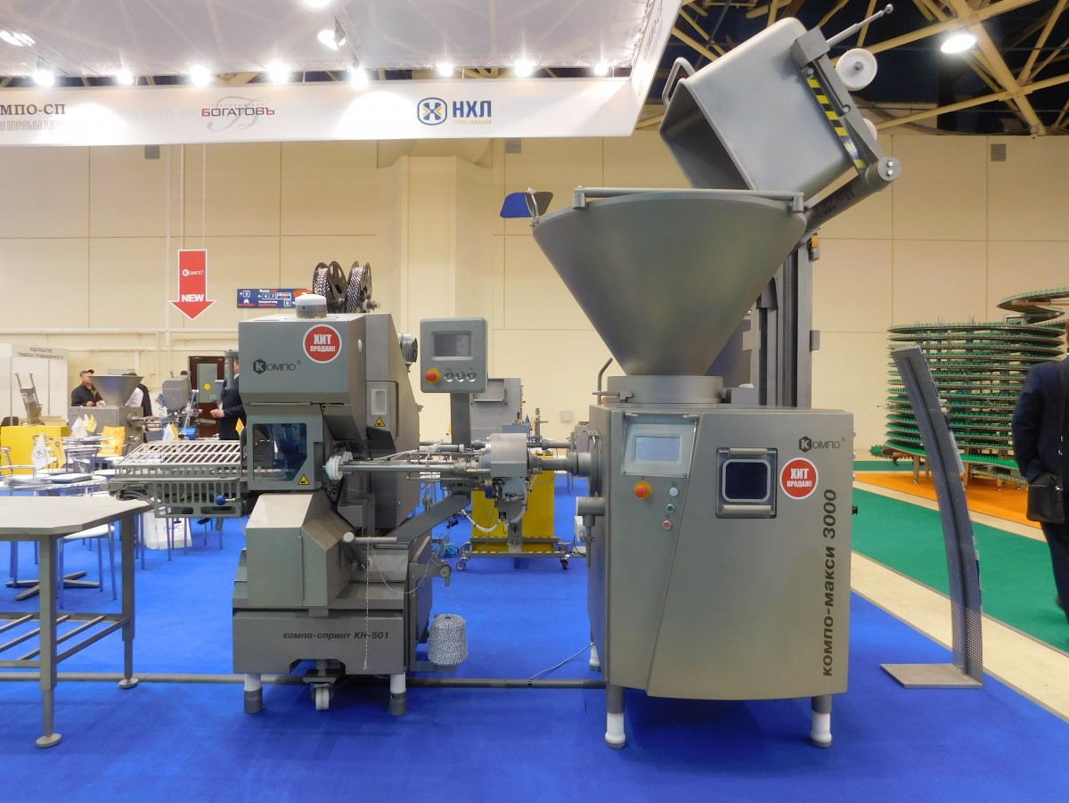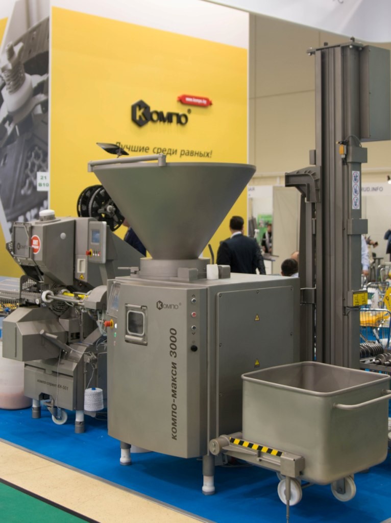 Vacuum screw filler KOMPO MAXI 3000 is designed for stuffing and dosing minced meat of boiled, cooked smoked, semi-smoked, raw-smoked and dry sausages, frankfurters, small sausages and other paste-like masses.